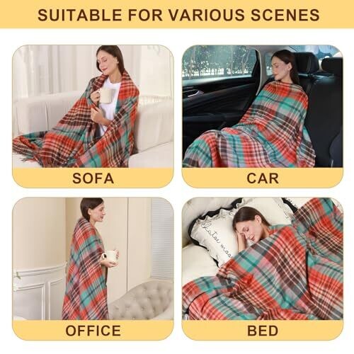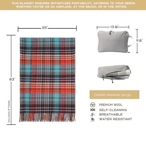 A soft, lightweight pure wool blanket designed for comfort at home or on the go. Measuring 55x83 inches and weighing about 1.5 lbs, it’s breathable with fringed edges and a Tartan-Red pinstripe for couch, bed, or travel use.