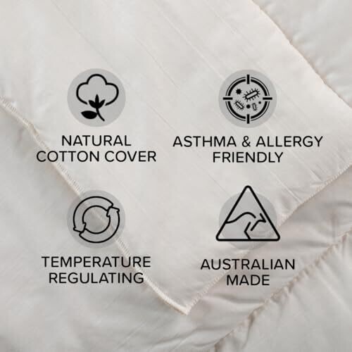 Experience year‑round comfort with a medium weight Australian wool quilt. Natural cotton cover keeps air flowing for cooler nights, while wool fill regulates temperature and moisture. Dust mite resistance supports asthma and allergy relief, crafted in Australia for lasting warmth and durability.