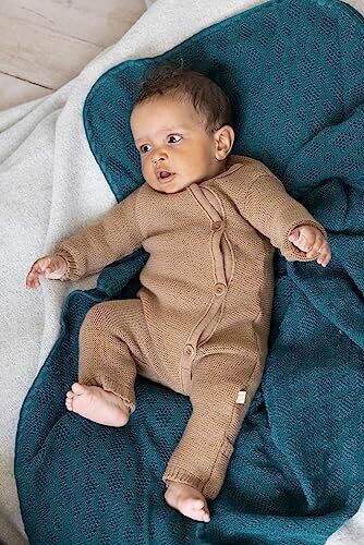 Cuddly soft, breathable merino wool blanket for newborns to toddlers. Classic Ajour pattern adds heirloom charm, while natural wool regulates temperature for all seasons. Handcrafted in Germany with eco-friendly practices, unisex design, perfect as baby first equipment.