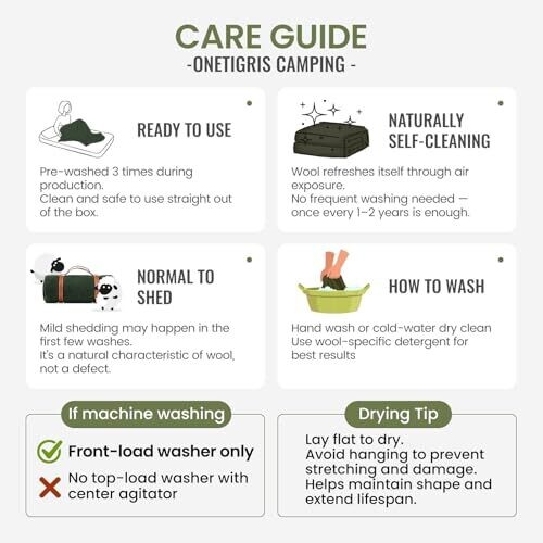 • hand wash or dry clean with wool-specific detergent; machine washing on gentle cycle for front-loading washers; occasional airing; initial shedding may occur
