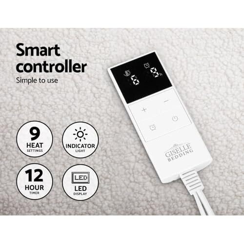 Giselle Bedding Electric Blanket offers a soft fleecy underside for cozy warmth. The fully fitted design stays in place, with a detachable LED controller, 9 heat settings, a 12-hour timer, and machine washable convenience for bed, sofa, or lounge.