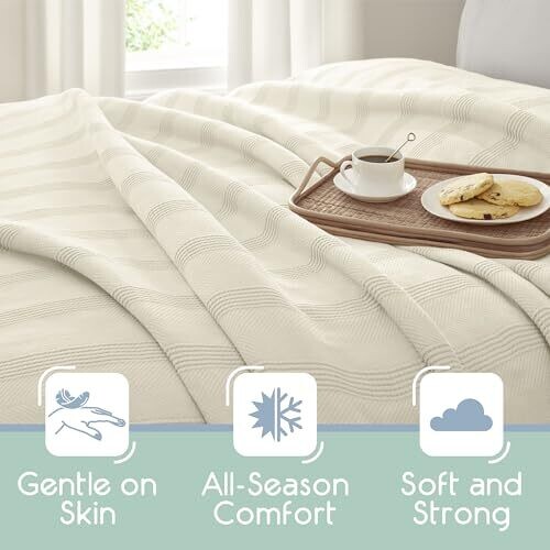 Experience ultra-soft, breathable 100% cotton with this king-size blanket. Lightweight yet warm for all seasons, its herringbone weave adds timeless style. Ivory tone complements any decor, easy-care and OEKO-TEX certified for hotel-luxury, everyday use.