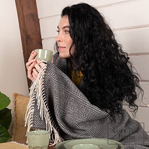 • Lyhome Merino Wool Blanket - Large Throw Bedspread for Sofa & Bed, Chevron Pattern