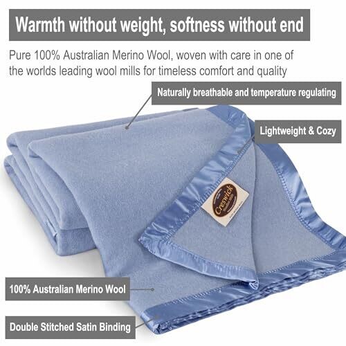 Experience timeless luxury with a 100% Australian Merino wool blanket from Creswick Woollen Mills. Breathable, warm without bulk, and finished with a satin binding for a refined look—perfect for all seasons in French Blue, ethically produced.